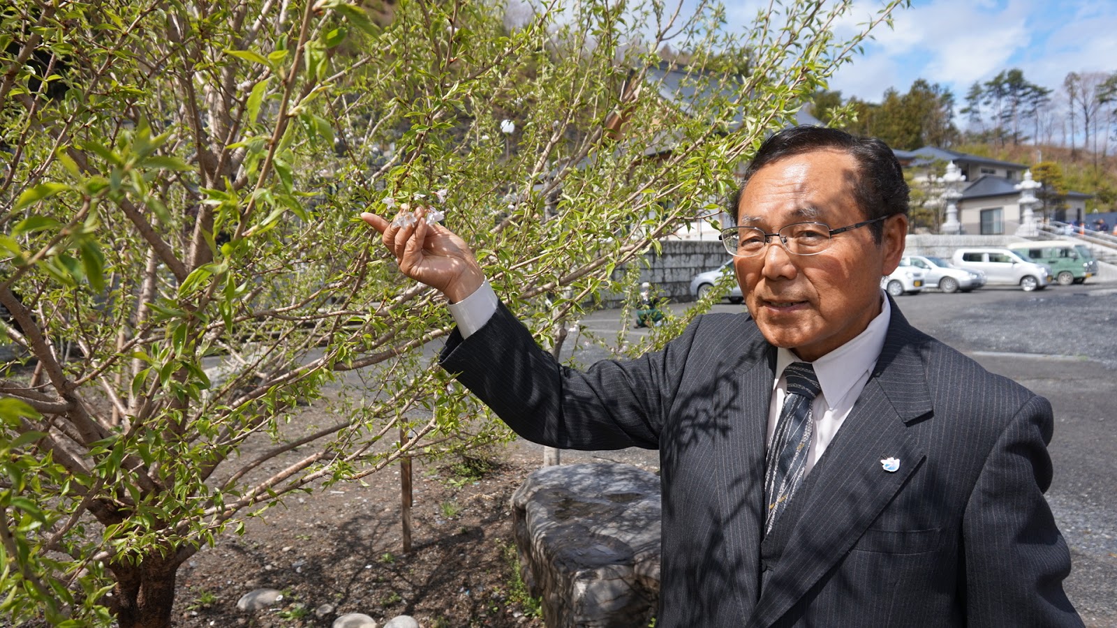 | 岩手県大槌町の蓮乗寺で開花した山梨県北杜市の神代桜子桜。山梨と岩手を結ぶ新たな、そして永代の絆の証となります |