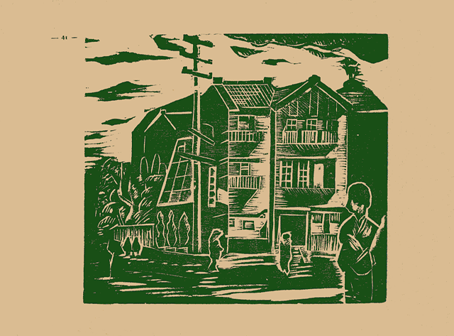B「この版畫に見えるやうに、陽が斜からさした具合は感じがいゝね、ウインドは角に二方から見えるやうになつてゐるし、効果があるよ」