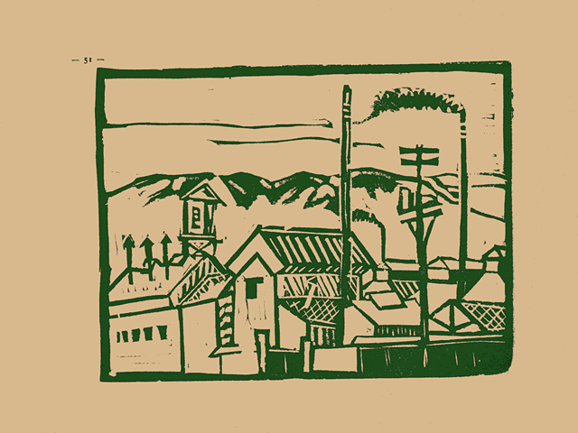 横濱開港當時、「サゲ絲」と稱して外國に輸出したのは甲州産の生絲で、これが本邦生絲輸出の嚆矢だ。明治九年には、縣營の勸業製糸工場が創設された。その後縣下養蠶業の發展と並行して製糸業は漸次擴張進展し、鐘紡、矢島、丸茂、武井、望月、堀内、田中、三浦、小田切等今や八十四工場、男女工、六千人、生産額六百萬圓に達してゐる。 版畫は矢島第三工場のバツクスタイル。乾燥室、倉庫、機關室、立ち並ぶ[# 原本では「立ら並ぶ」となっている]工場、三筋のホワイトラインを刻んだ煙突からは、黒煙濛々として甲府の空を覆つてゐる。 遠景に輝く日本南アルプスの銀嶺と、若き女性の手よりたぐり出されるシルクとのコン[# 原本では「シ」となっている]トラストは、山梨にふさはしい魅[# 原本では「味」となっている]惑的な風景の一つである。