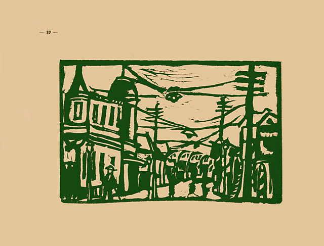 版畫の左側に見える丸屋根の建物は有信銀行で、吊燈、街燈、スズラン燈かゞやく銀座通りの中央に、王者の如く頑張り其の堅實振りを發揮してゐる。