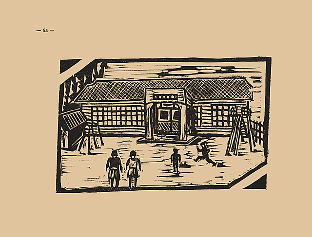 フレーベルでなくとも彼等には彼等の世界がある。道徳がある。友情があることは知つてゐる。幼稚園には、老稚園や養老院の規則は適用されない。 郷に入つては郷にしたがはなければならない。 アメ アメ フレ フレ カアサンガ ジヤノメデ オムカヘ ウレシイナ…… 實際うれしそうなその姿を見てゐると羨ましき限りである。 版畫は城北幼稚園を示したもの。この外本市には進徳、カートメル、羊の家、富士川、二葉、甲府、穴切E、T、Cを數へられる。