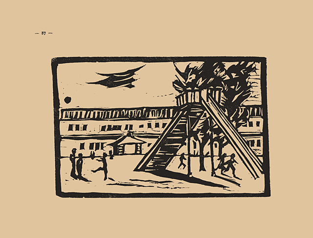 甲府市に於ける小學校には、富士川、琢美、相生、新紺屋、穴切、湯田、春日、朝日、伊勢の九校がある。何れも増改築が行はれ、施設萬端整へられ、一萬數千の兒童は嬉々として勉學にいそしみ、各校ともそれぞれ特色を發揮してゐる。 年毎に膨脹する兒童をよりよく育てんがため、或はプールを作り、學校看護婦を置き、夏季聚落に、兒童映畫デーに、各種の施設が設けられ、又近く高等科の獨立も圖られ、これが内容の充實も企劃されてゐる。この版畫は相生小學校の運動場の一部をスケツチしたもので、滑臺を中心に嬉戯する子供等は、空に漂ふ一抹のちぎれ雲にもまして晴やかに見える。
