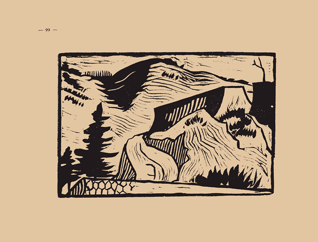 愛宕山と言へば甲府市の誰もがなつかしい山だ。 午報のドンはこの山の續き桃山からうちだされるし、[# 原本では改行されているため「、」がないので入れた]夏の夜の花火はこの山からあげられるのだ。 山の中腹には水道部あり、成田山あり、その麓には公園あり、精乳舍あり、中央線と身延線とは平行してこの麓をめぐつてゐる。 版畫は愛宕山の最南端にある別莊地から、山の中央附近を眺めたもので、右手前は別莊地の石垣、中央の坂道を自動車が上下して、こゝに一大別莊地帶を作らうとする計劃である。