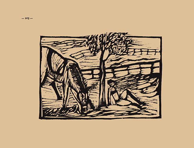 版畫は、一人の騎手が、楊の根本に憩ふて、遠い八ッ岳の峰を仰いでゐるところです。