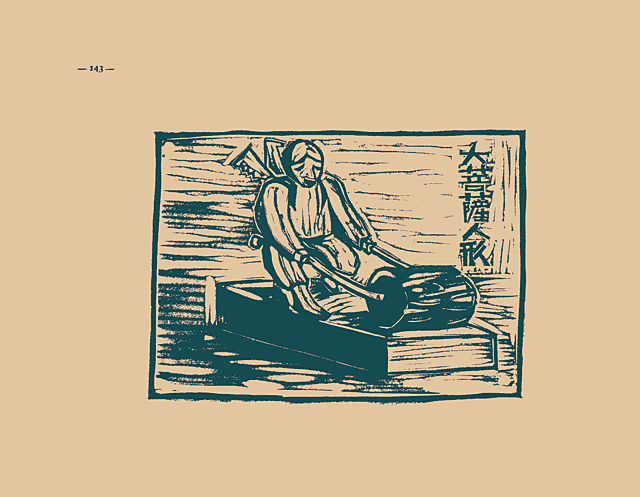 山から木を切り出して束ね「ゴロカン」を通して、ゴロゴロ轉して下つて來る、一寸變つたローカルカラーの木彫です。