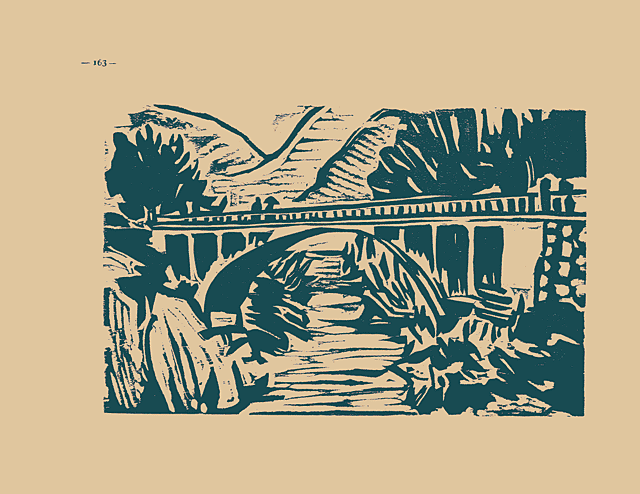 版畫は甲府より自動車で約三十分、和田峠を越へて二時間、昇仙峽の第一歩に架せられた鐵筋コンクリートの近代味豐な長潭橋で、よく自然美に調和してゐる。下の流は人も知る長潭の清潭である。橋の右側は天神平と稱し、休憩所、土産物の賣店、駐車場等がある。夏は滿山の緑を、秋は燃えるやうな紅葉を、青ガラスのやうな水は、飛游するヤマメの銀鱗とともに反映させて、動くが如く又動かざるが如く流れてゐる。遠景に見ゆる山又山は仙境の山々、これに連る奧御嶽の靈峰は、水晶の産地として有名である。