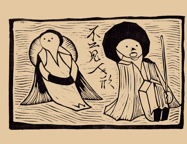 甲斐とはアイヌ語のカヒで、山地多く物を背負つてゆく意である。 富士も矢張りアイヌ語のフチから來た當字で不二、不死、不盡とも書かれてゐる。フチとは火の神、火の姥母の謂である。昔から若い人は外に出て働き、老母が火の番をしてゐることから、火は女性でシンボライズされてゐる。 富士のマスコツトが木花咲爺姫であることも、この點からうなづける。 この人形は吉田地方の製作、登る前の憩か、下山後の憩かその點は知らないが、何れにしても表情、服裝、姿態から靈峯富士への憧憬がよく現はれてゐる。