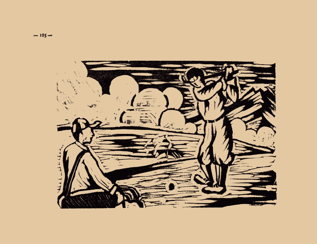 版畫は山中湖畔ゴルフ場を示したもので、富士を見上げて緑の芝生のスロープを利用したゴルフリング、[# 原本では改行されているため「、」がないので入れた]眞に天下の好球場である。この外スキー場、競馬場をはじめ帝大、一高、高師等の寄宿舍、グラウンド、日本青年館分館等が設けられ、今や國立公園として飛躍のスタートを切つてゐる。